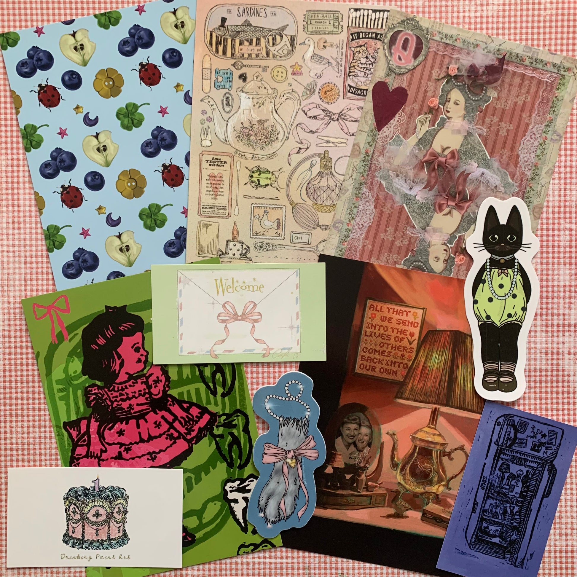 10 perfectly imperfect items from my studio: misprinted postcards, old business cards, overstock, etc. - Sticker sheets count as 3 items!